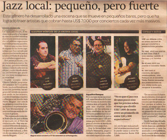 Perú is a multicultural country with a wide variety of traditions, heritage and mixtures: Incas, Spanish, Afroperuvian, Arabian, Creole, Chinese, Japanese, all in one complex country. Jazz is also a complex word that involves different styles and mixtures from its beginnings to the present day. Peruvian Jazz is a rising and evolving path in Perú so it’s easy to understand why it isn’t well known by many peruvians and the international jazz audience yet. The Afroperuvian music is the most used by musicians to get a fresh flavor since the first Peruvian Jazz recordings - more than 30 years ago.